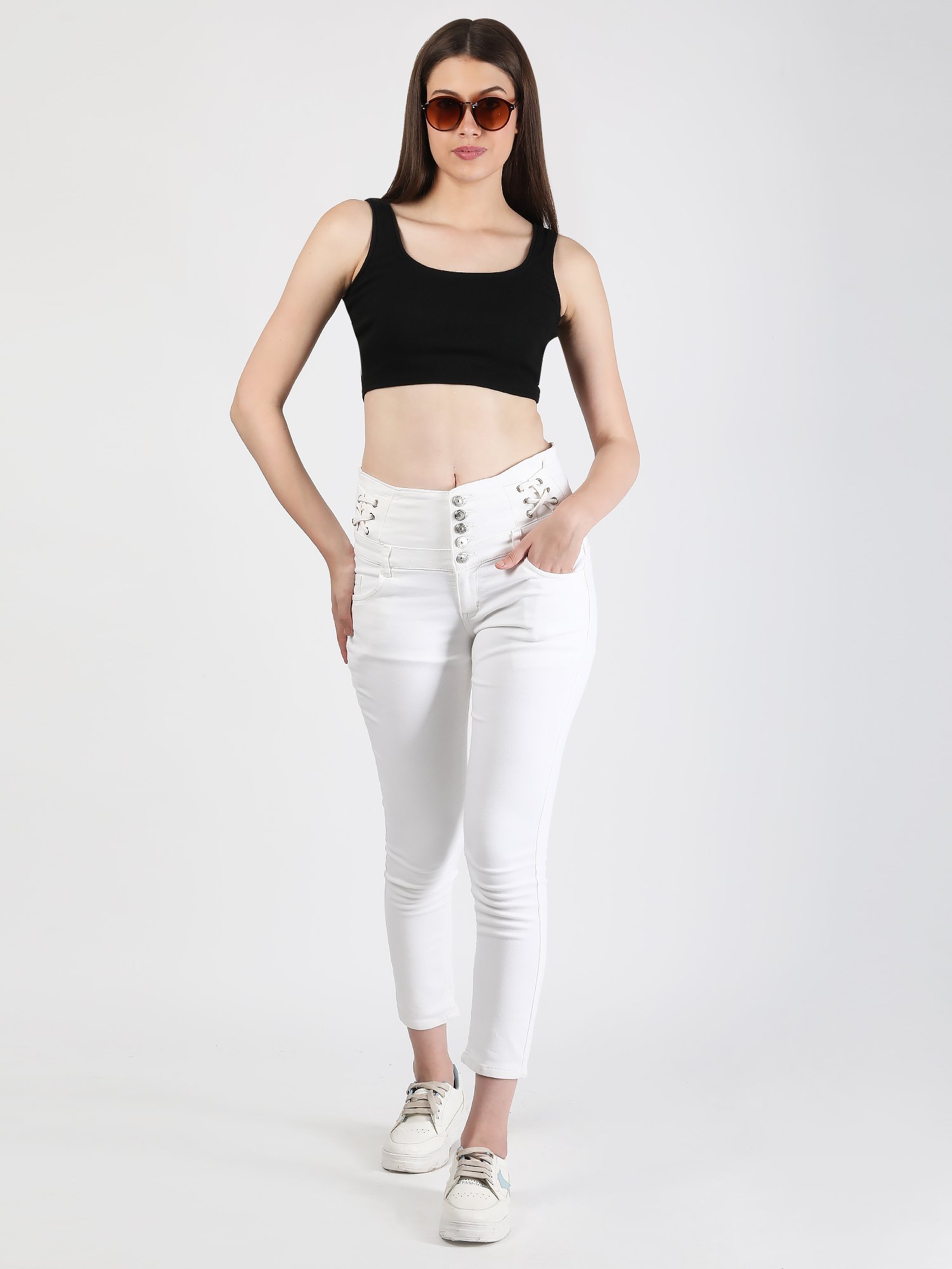 YesTen Women’s White Lycra Denim 5-Button I-Let Jeans – Skinny Fit, Stylish Casual & Festive Look
