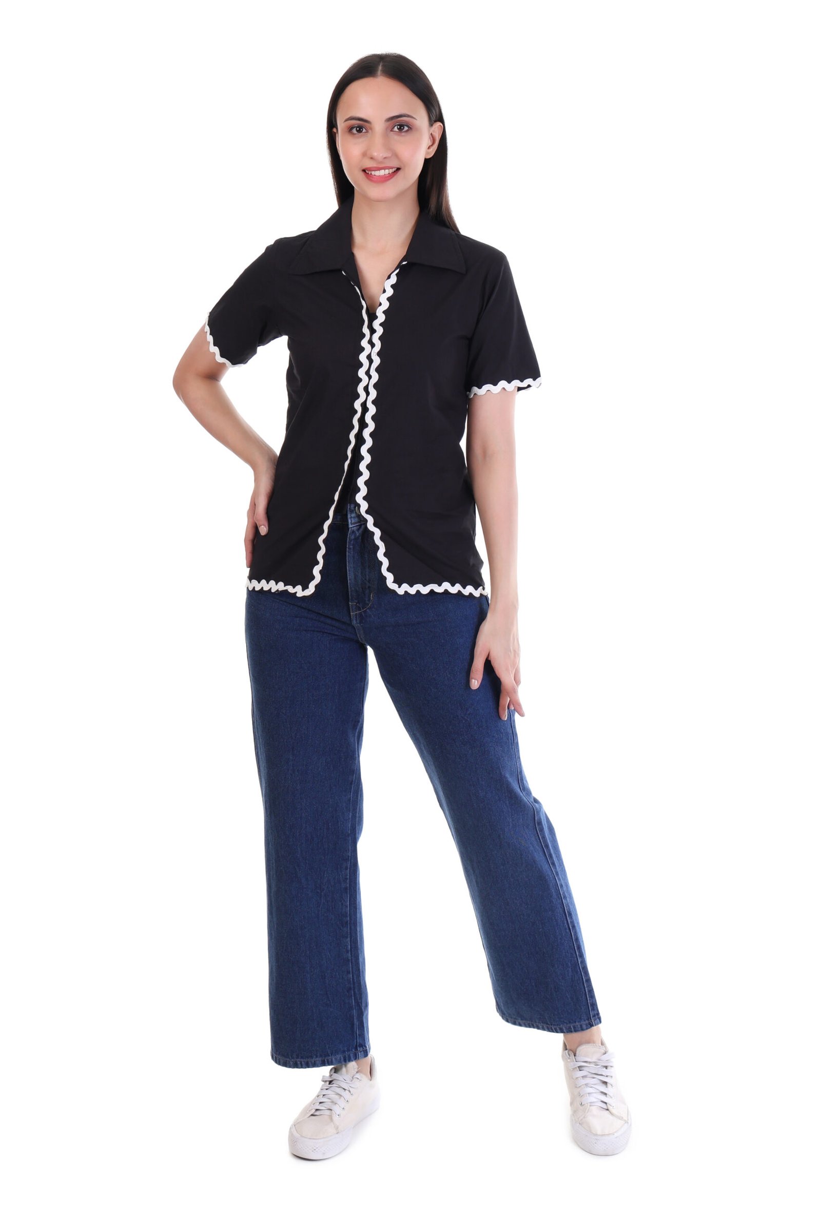 YesTen Women’s Black Cotton Lace Top – Non-Stretch Regular Fit, Elegant Shirt Neck Party Wear